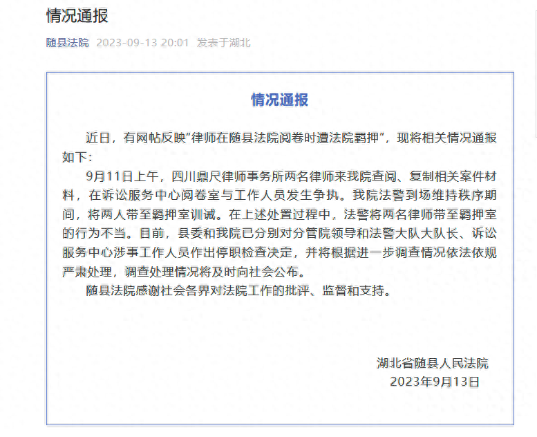 律师阅卷时被羁押两小时?湖北随县法院:涉事人员已停职