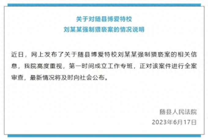 一审法院的判决认定事实是否清楚、罪名是否准确、量刑是否适当,引发了公众质疑。随后,6月17日,随县人民法院发布通报称:近日,网上发布了关于随县博爱特校刘某某强制猥亵案的相关信息,我院高度重视,第一时间成立工作专班,正对该案件进行全案审查,最新情况将及时向社会公布。