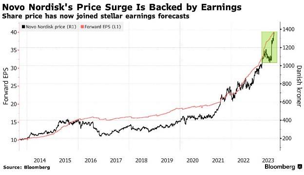 自2014年1月该公司上一次分拆股票以来,诺和诺德股价已上涨近7倍,在分拆生效前一天,盘中一度达到逾1380丹麦克朗(合198美元)的峰值。