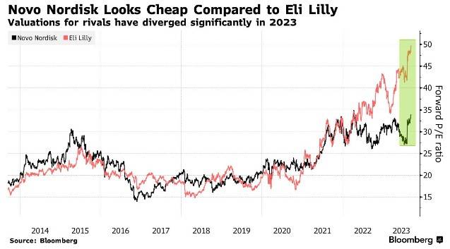 虽然这一市盈率几乎是斯托克600医疗保健分类指数的两倍,但低于诺和诺和的主要肥胖药物竞争对手礼来。礼来公司的预期市盈率约为50倍,这不仅得益于其在减肥药领域的潜力,还得益于其实验性治疗阿尔茨海默病的试验取得了成功,这是制药行业的另一个热门领域。