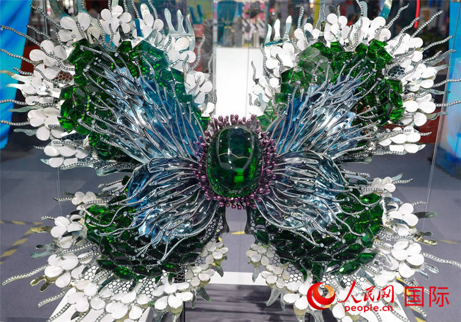 11月5日,消费品展区展出的由玻璃和贝母材料打造的蝴蝶造型环保艺术作品。人民网记者 李美玉摄