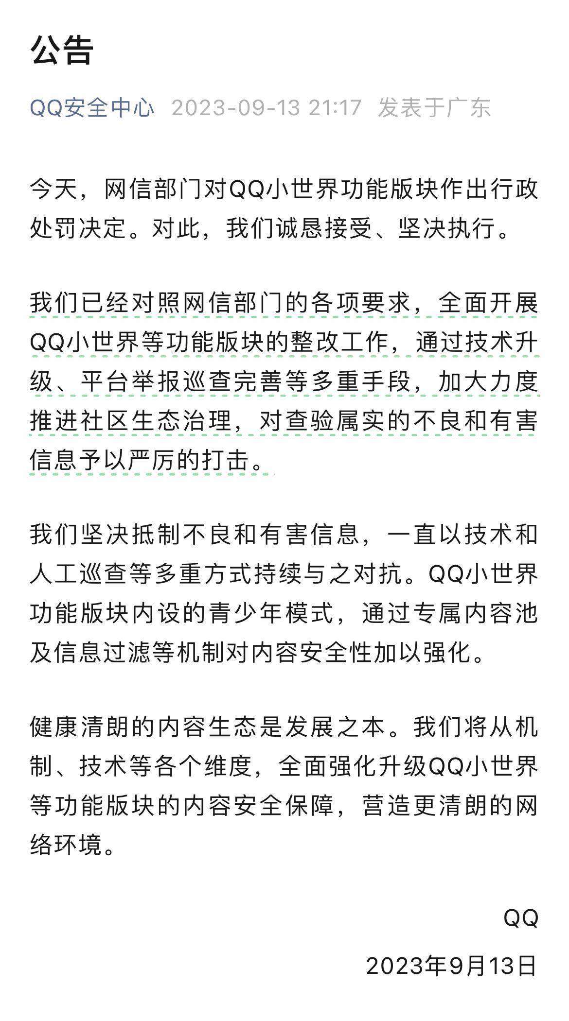 “今天,网信部门对QQ小世界功能版块作出行政处罚决定。对此,我们诚恳接受、坚决执行。”9月13日晚9时许,QQ安全中心发布一则“公告”,回应被网信部门的处罚。