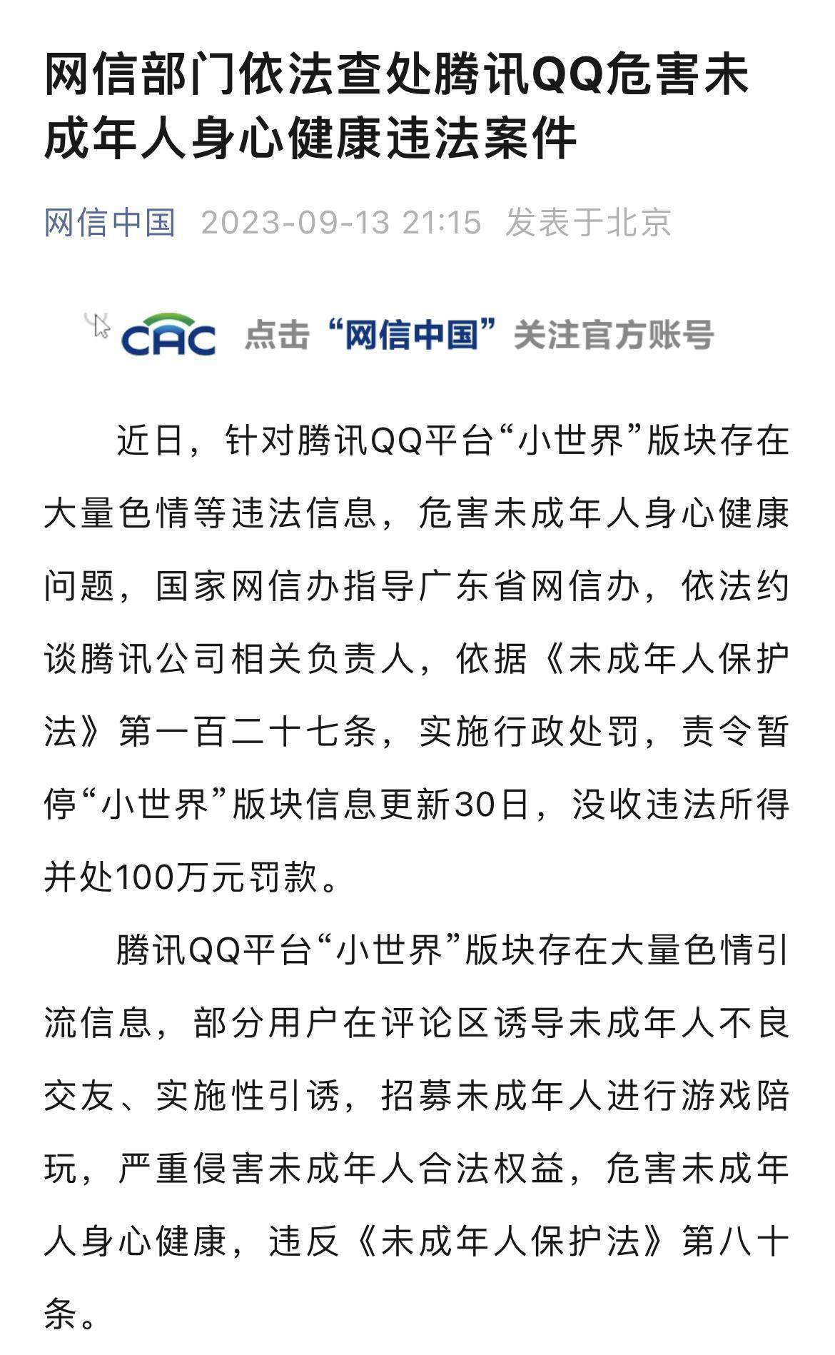 9月13日晚,据“网信中国”微信公众号消息,针对腾讯QQ平台“小世界”版块存在大量色情等违法信息,危害未成年人身心健康问题,国家网信办指导广东省网信办,依法约谈腾讯公司相关负责人,依据《未成年人保护法》第一百二十七条,实施行政处罚,责令暂停“小世界”版块信息更新30日,没收违法所得并处100万元罚款。