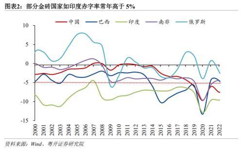 1995、1996年欧盟赤字率就已突破3%,分别达到7.2%和4.2%。当遭遇国际金融危机时,欧盟赤字率再度果断突破3%,2009-2013年分别为6.7%、6.4%、4.5%、4.3%和3.3%,均突破3%,以实现尽快推动经济回升的目标。美、日、德、法、英国在金融危机时期均突破3%,金砖国家如印度常年高于5%。当遭遇世纪疫情时,2020年美、英、德、法、日赤字率分别达到14.0%、13.0%、4.3%、9.0%和9.1%。由此可知,欧美经济体早已放弃3%的警戒线标准,而采取更加务实的举措,当经济遭遇重大危机和下行冲击时,果断突破赤字率3%的束缚。