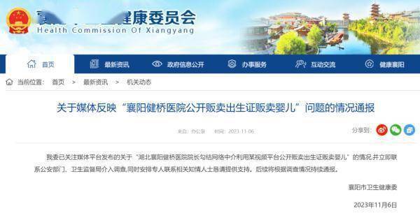11月7日下午,湖北省襄阳市卫健委针对媒体反映“襄阳健桥医院公开贩卖出生证贩卖婴儿”问题作出情况通报。