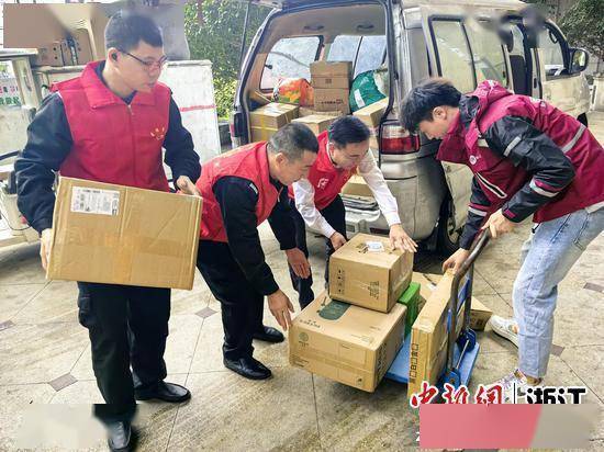 “红蜂”党员志愿服务队利用休息时间协助小哥搬运快递包裹。曹娥街道 供图
