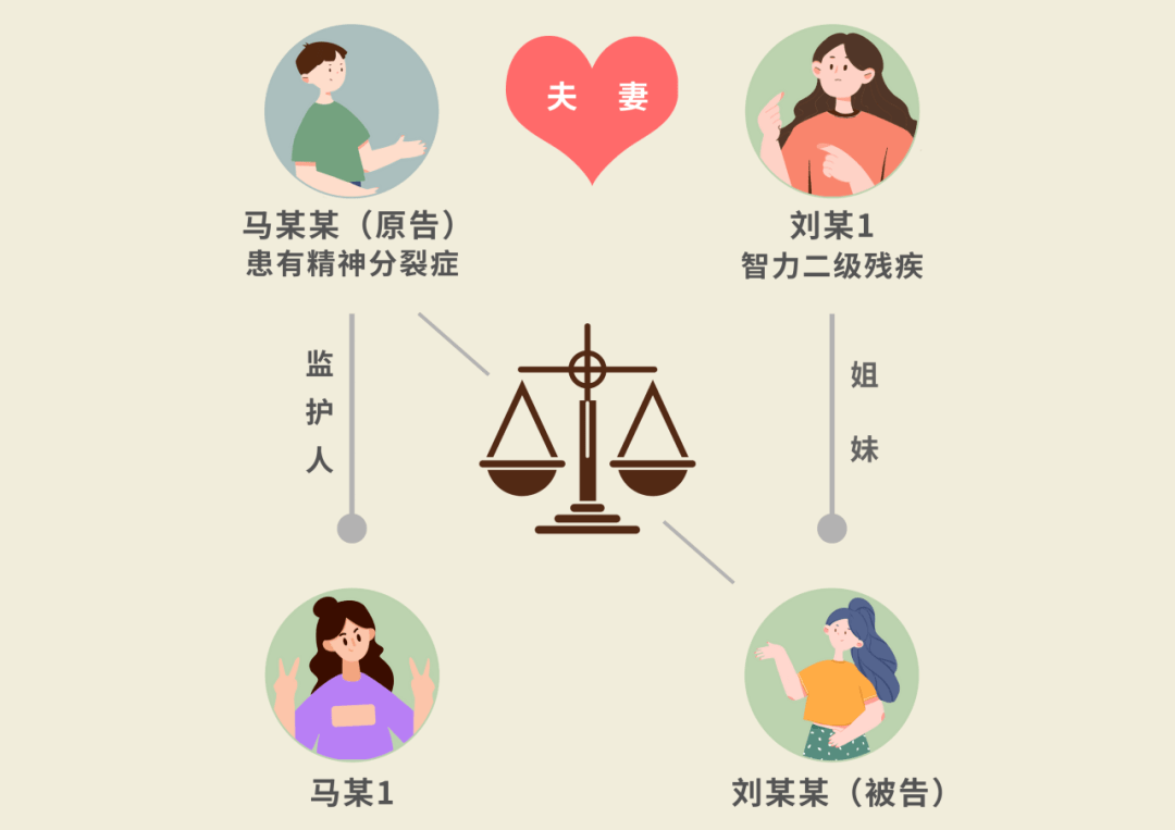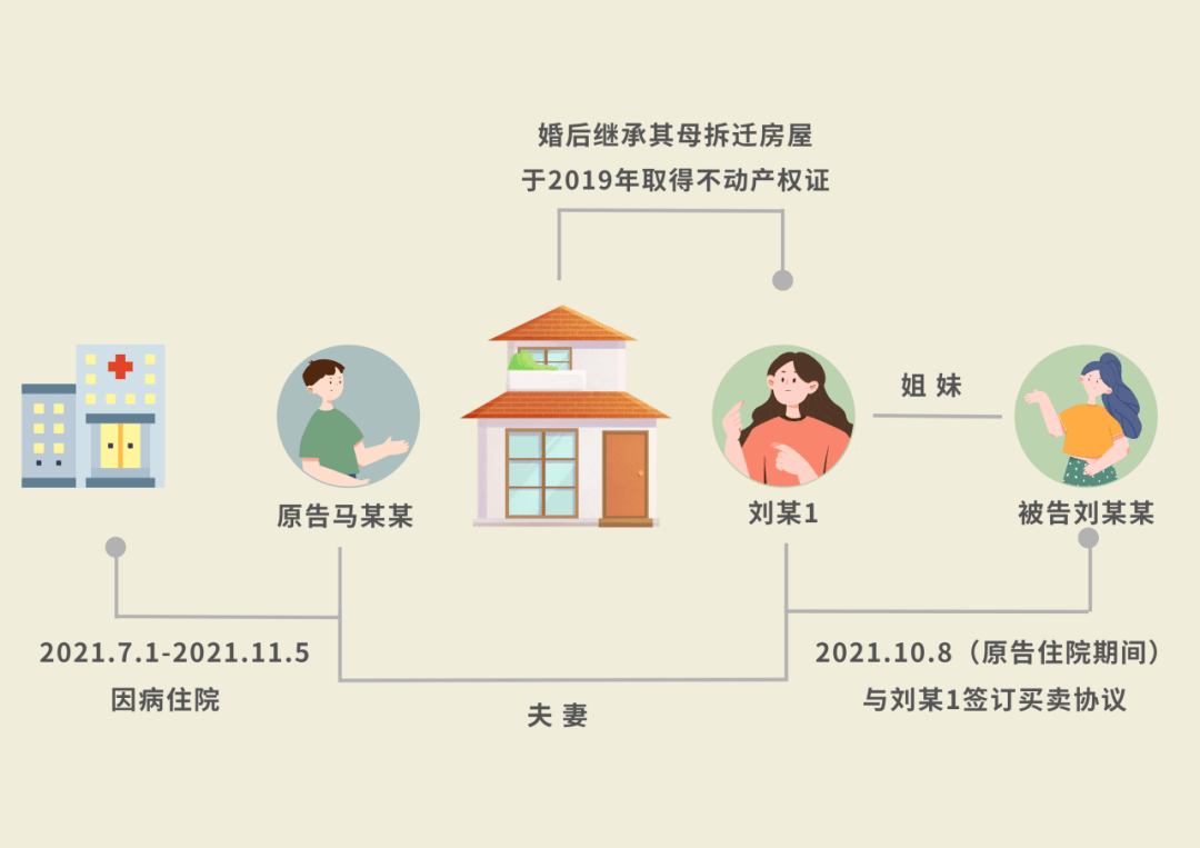 原告马某某与刘某1系夫妻关系,二人无子女。被告刘某某与刘某1系姐妹关系,刘某1系智力二级残疾。刘某1婚后继承其母拆迁房屋,并于2008年与村委会签订《拆迁安置补偿协议》,约定按1:1比例完成还迁安置。2019年,刘某1与天津市某建设公司签署经济适用住房买卖合同,购买诉争房屋,后取得不动产权证。2021年7月1日至2021年11月5日期间,原告因病住院接受治疗。