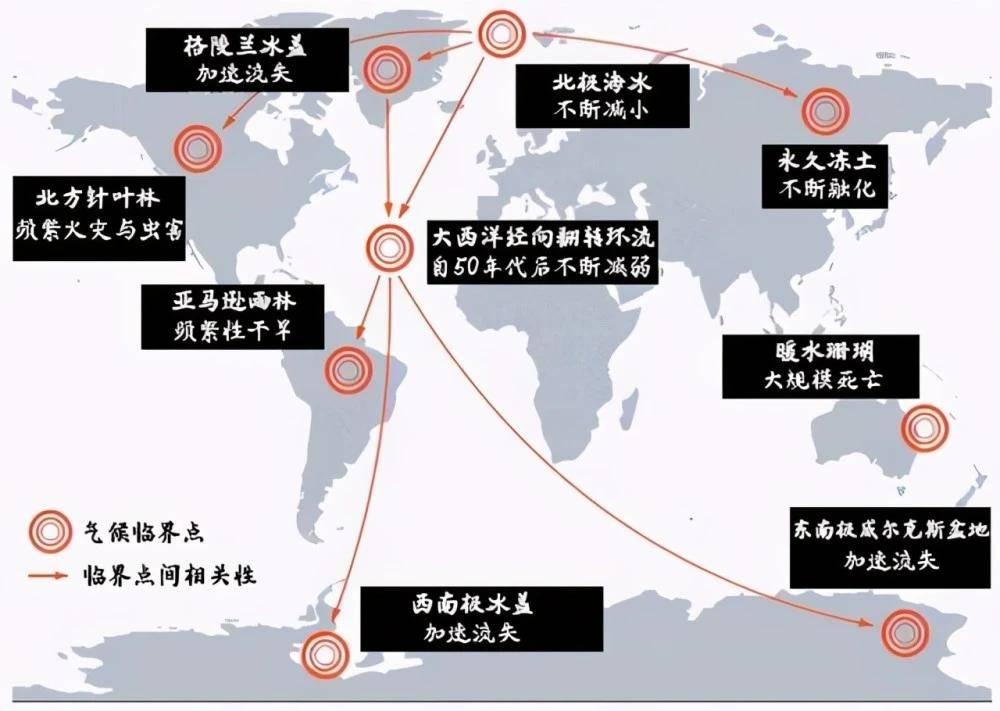 北极海冰、格陵兰冰盖、北方针叶林、永久冻土、大西洋经向翻转环流、亚马逊雨林、暖水珊瑚、西南极冰盖、东南极部分地区。