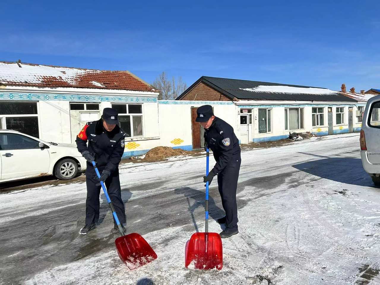 雪后道路结冰给旅客出行带来不便,尤其是桑根达来站区附近道路积雪较厚。为保障旅客出行安全,桑根达来车站派出所组织青年民警成立先锋队,紧急出动,清扫道路积雪,铲除道路结冰,以最快的速度清理出一条可供行人和车辆安全出行的道路,他们忙碌的身影是对旅客出行安全最大的保证。
