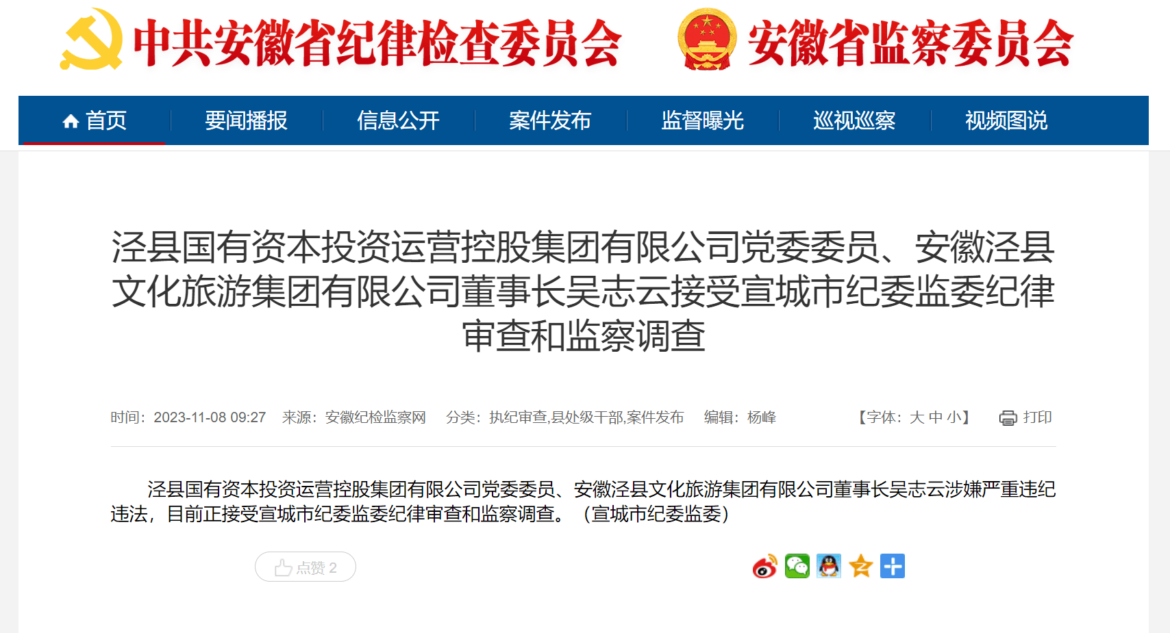 11月8日,据安徽省纪委监委网站消息:泾县国有资本投资运营控股集团有限公司党委委员、安徽泾县文化旅游集团有限公司董事长吴志云涉嫌严重违纪违法。