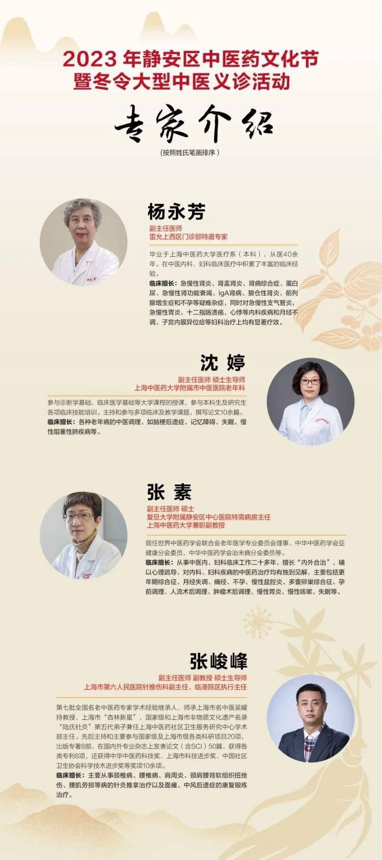 来自华山医院、岳阳医院、龙华医院、上海市中医医院、上海市针灸经络研究所、静安区中心医院、静安区中医医院等12家医疗及研究机构的20位名医专家将亲临义诊活动现场,为居民提供专业的问诊咨询服务及冬令健康养生建议。