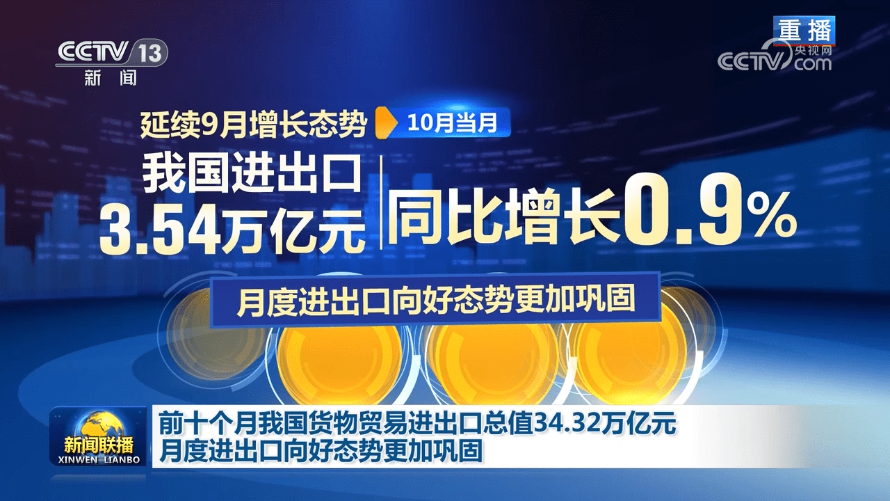 据海关统计,今年前10个月,我国货物贸易进出口总值34.32万亿元,同比微增0.03%。