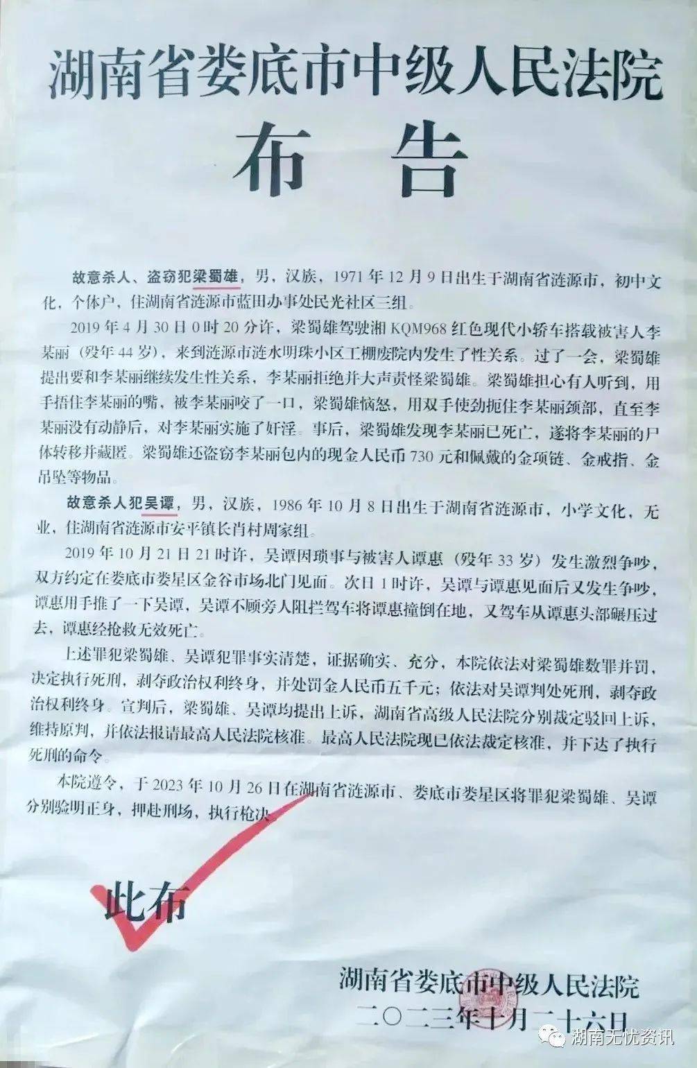 本院遵令,于2023年10月26日在湖南省涟源市、娄底市娄星区将罪犯梁蜀雄、吴谭分别验明正身,押赴刑场,执行枪决。