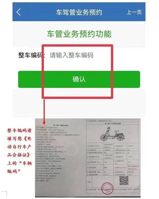 3.最后,输入电动自行车车辆整车编码,选择确认办理地点和预约时间,即可完成预约。