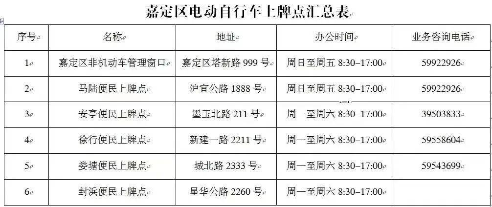 注:以上便民上牌点仅办理电动自行车上牌业务。电动自行车注销、转移登记、补牌等业务需前往嘉定区非机动车管理窗口办理(除注销业务外,其他业务均需交验车辆)。