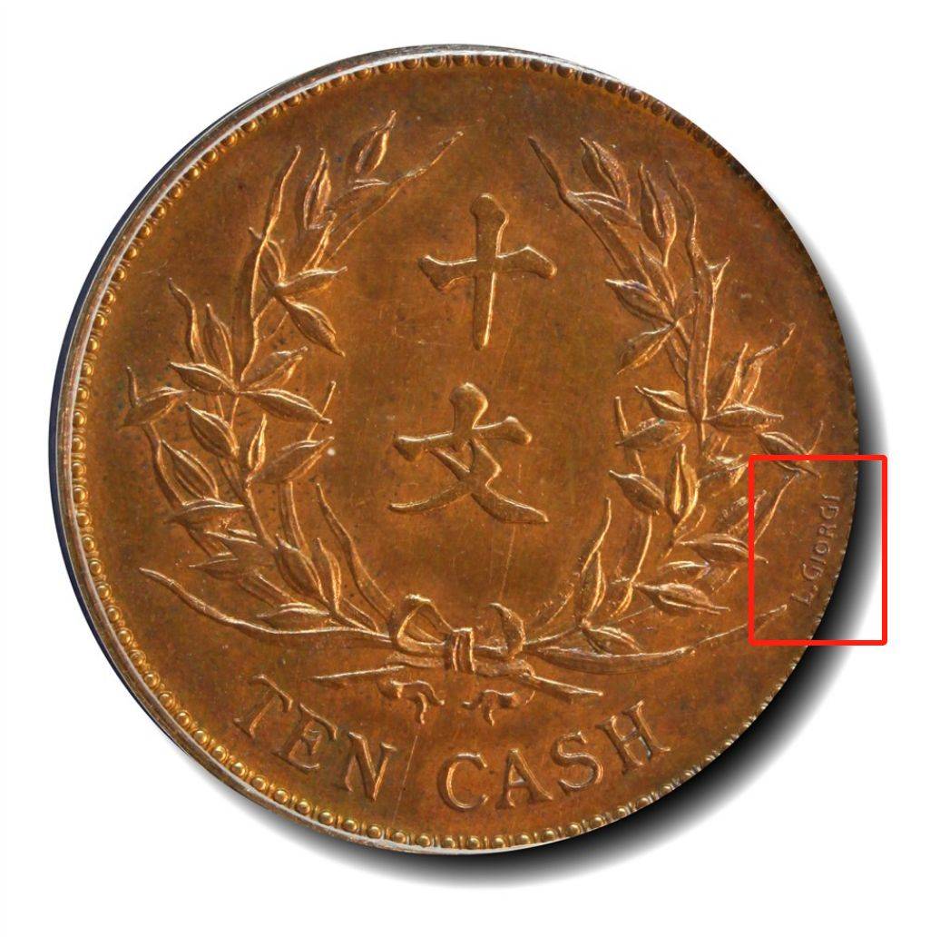 我们也可以放大来看签字是什么样的。可以看到,在币面右侧有一串英文签名,这就是天津造币总厂试铸的,由意大利总雕刻师路易·乔治刻模的样币,上面的英文,就是乔治的签名。