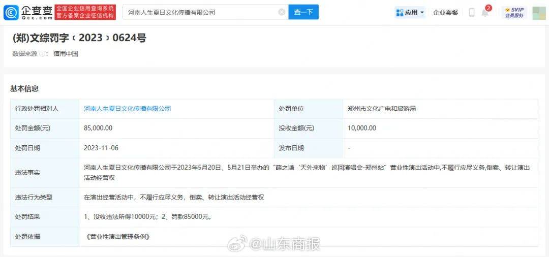 据@山东商报报道,企查查App显示,11月6日,郑州市文化广电和旅游局对河南人生夏日文化传播有限公司作出行政处罚。违法事实显示,该公司于2023年5月20日、5月21日举办的“薛之谦‘天外来物’巡回演唱会-郑州站”营业性演出活动中,不履行应尽义务,倒卖、转让演出活动经营权,被处没收违法所得1万元并罚款8.5万元。