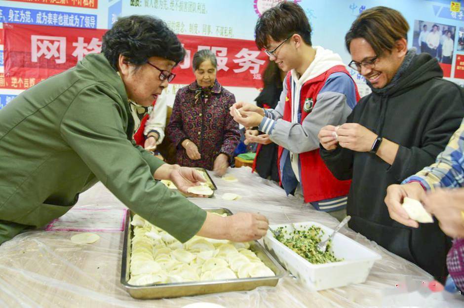 2023年11月8日,在江苏省镇江市官塘桥街道远洋社区和官塘桥村居家养老服务中心,外籍教师、大学生志愿者与居民一起包饺子,体验中国传统民俗。(石玉成摄/光明图片)