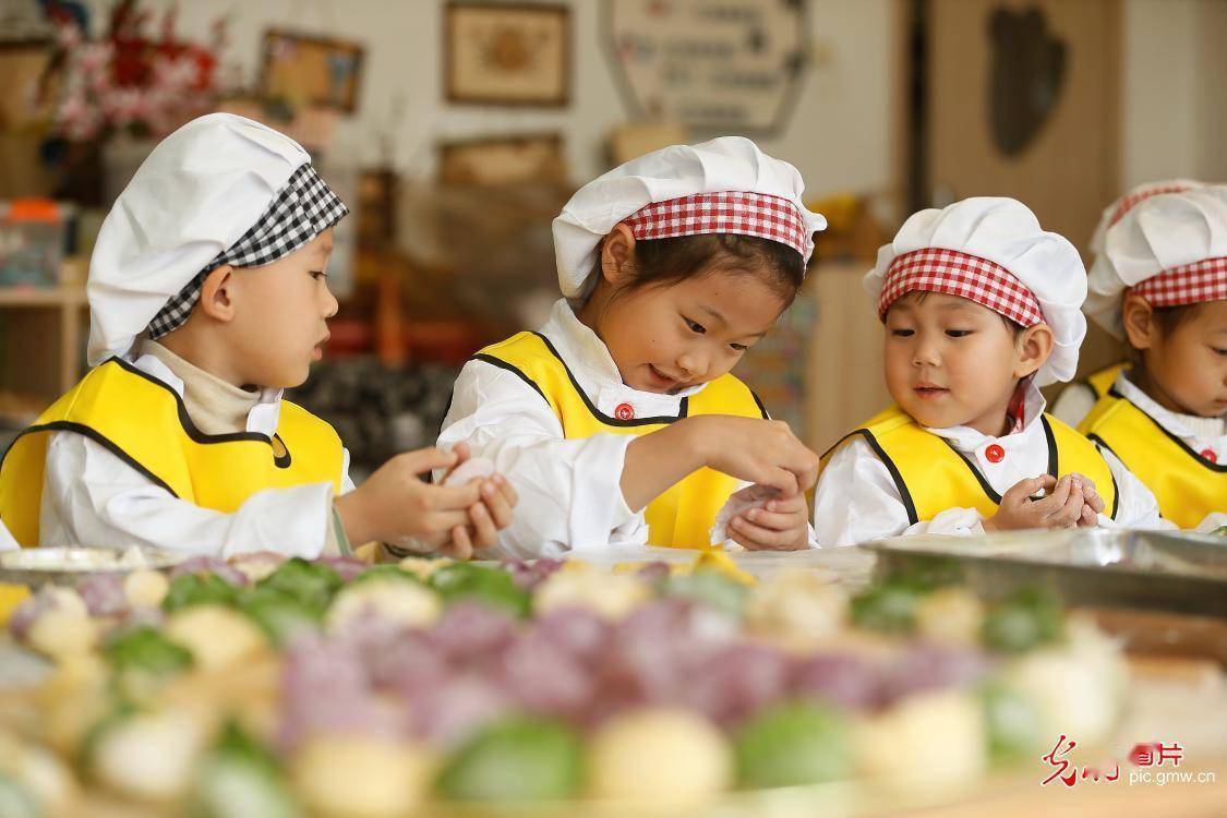 2023年11月8日,在河北省石家庄新乐市直幼儿园,小朋友在老师的指导下学习包饺子,了解传统民俗文化。(贾敏杰摄/光明图片)