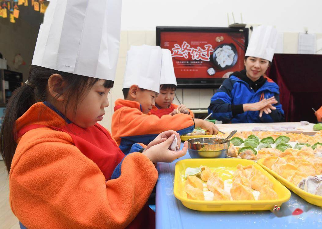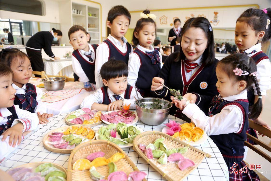 2023年11月8日,在江苏省连云港市苏外(连云港)幼儿园,老师教给小朋友学包立冬饺子,体验传统民俗文化。(王春摄/光明图片)
