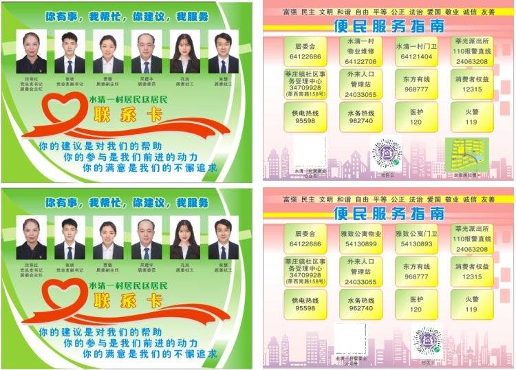 联系卡正面是水清一村居委干部人员的照片和姓名,方便居民找到人、找对人,快速解决问题;联系卡反面是便民服务指南,里面有居委会、物业、供电热线、水务热线等居民经常询问的电话号码。