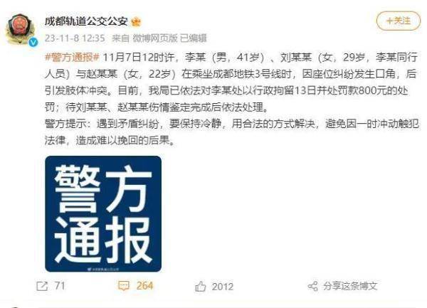 2023年11月8日,成都市公安局轨道公交分局发布警方通报: