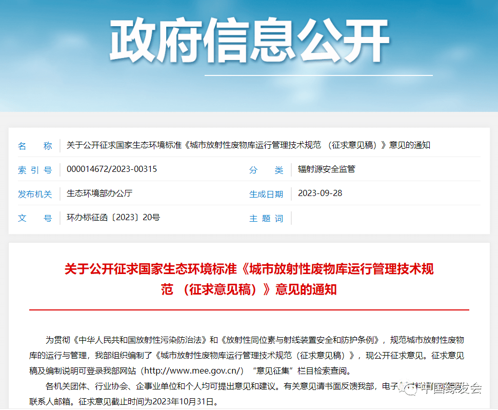 为贯彻《中华人民共和国放射性污染防治法》和《放射性同位素与射线装置安全和防护条例》,规范城市放射性废物库的运行与管理,生态环境部部组织编制了《城市放射性废物库运行管理技术规范(征求意见稿)》。2023年9月26日,生态环境部办公厅发布通知,公开征求国家生态环境标准《城市放射性废物库运行管理技术规范 (征求意见稿)》意见。