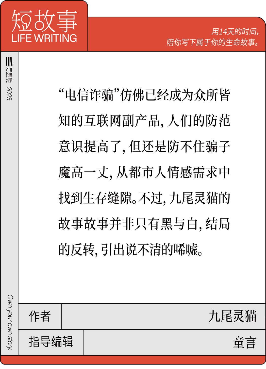11月16号-29号,新一期短故事Life Writing学院即将开始,我们希望用14天时间帮助你寻找并写出自己的故事,资深编辑将和你一对一交流沟通,挖掘被忽略的感受和故事,探寻背后的人文意义和公共价值。让你的个体经历与声音通过你自己的独特表达,被更多人听见和看见。
