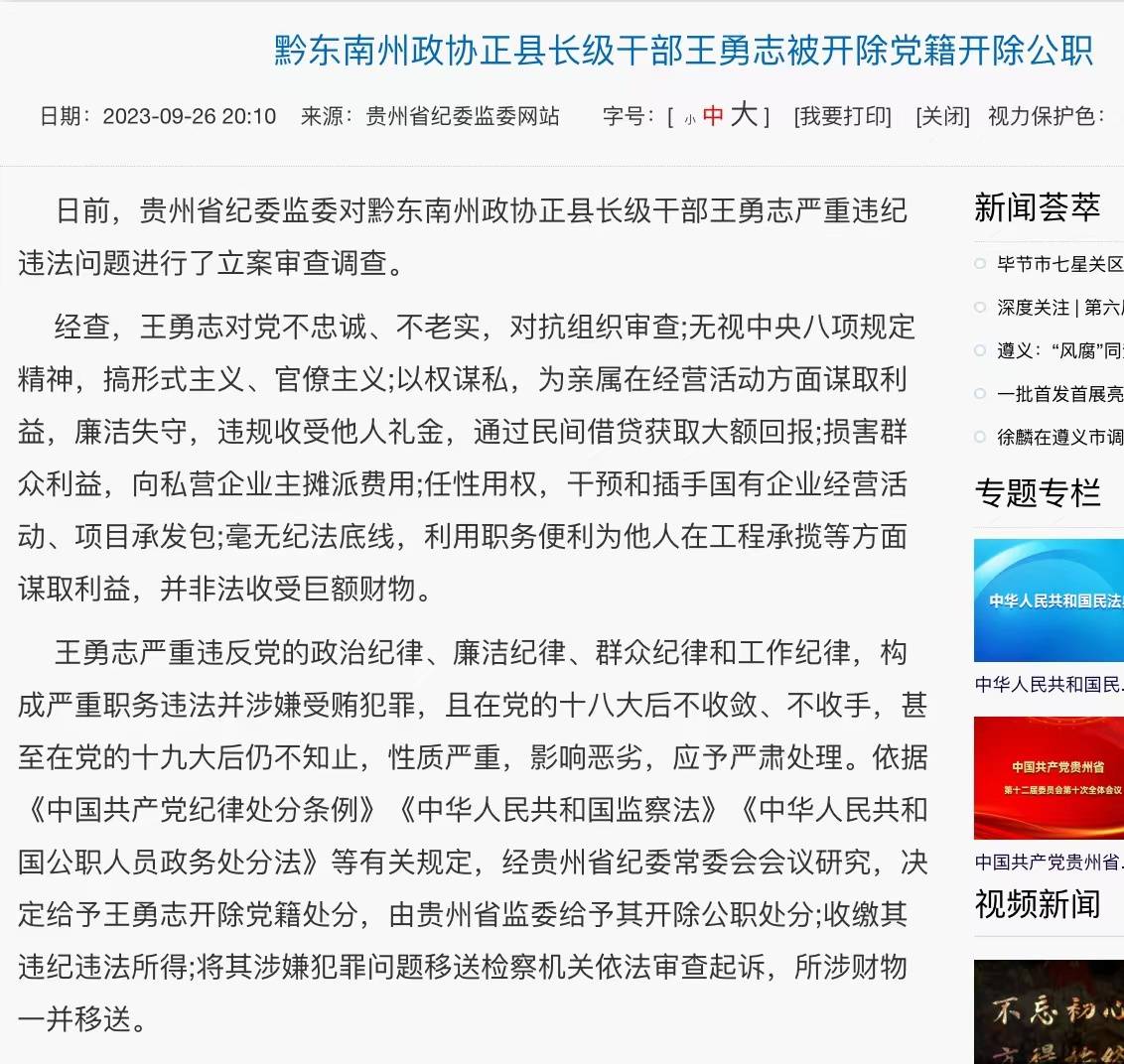 王勇志被开除党籍开除公职。图/贵州省纪委监委网站