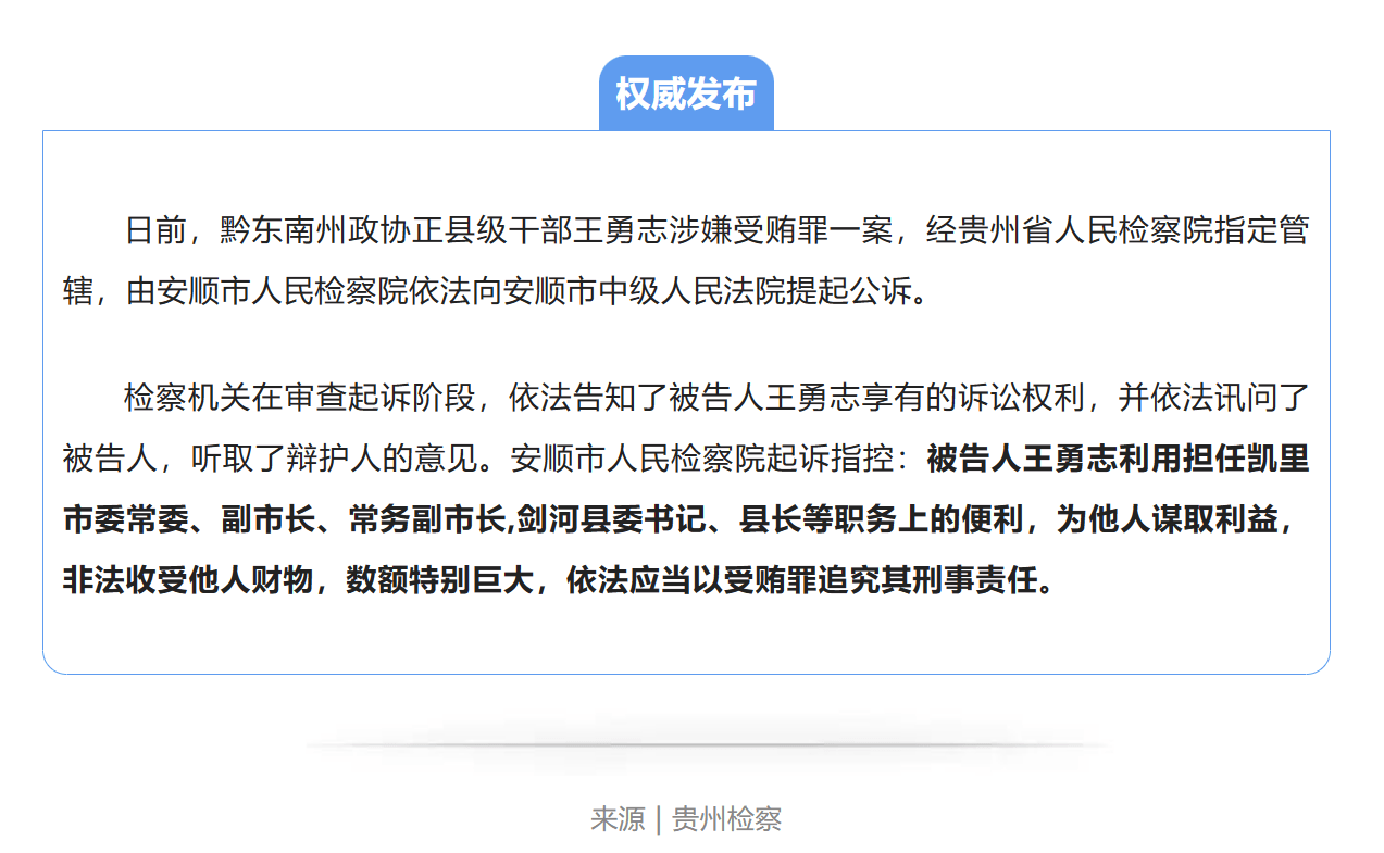 据贵州检察公众号11月8日消息,王勇志涉嫌受贿罪一案由安顺市人民检察院依法向安顺市中级人民法院提起公诉。