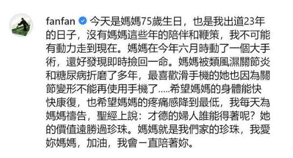 范玮琪也透露了母亲多年来一直受到类风湿关节炎和糖尿病的困扰,这次手术让她的健康状况更加艰难。范玮琪坦言,正是母亲多年来的陪伴和鼓励,才让她在演艺事业上坚持走到今天。她表示,希望母亲的身体能够早日康复,也希望母亲的疼痛能够减轻。范玮琪每天都在为母亲祈祷,她用圣经中的话语表达了对母亲的珍视和爱意。
