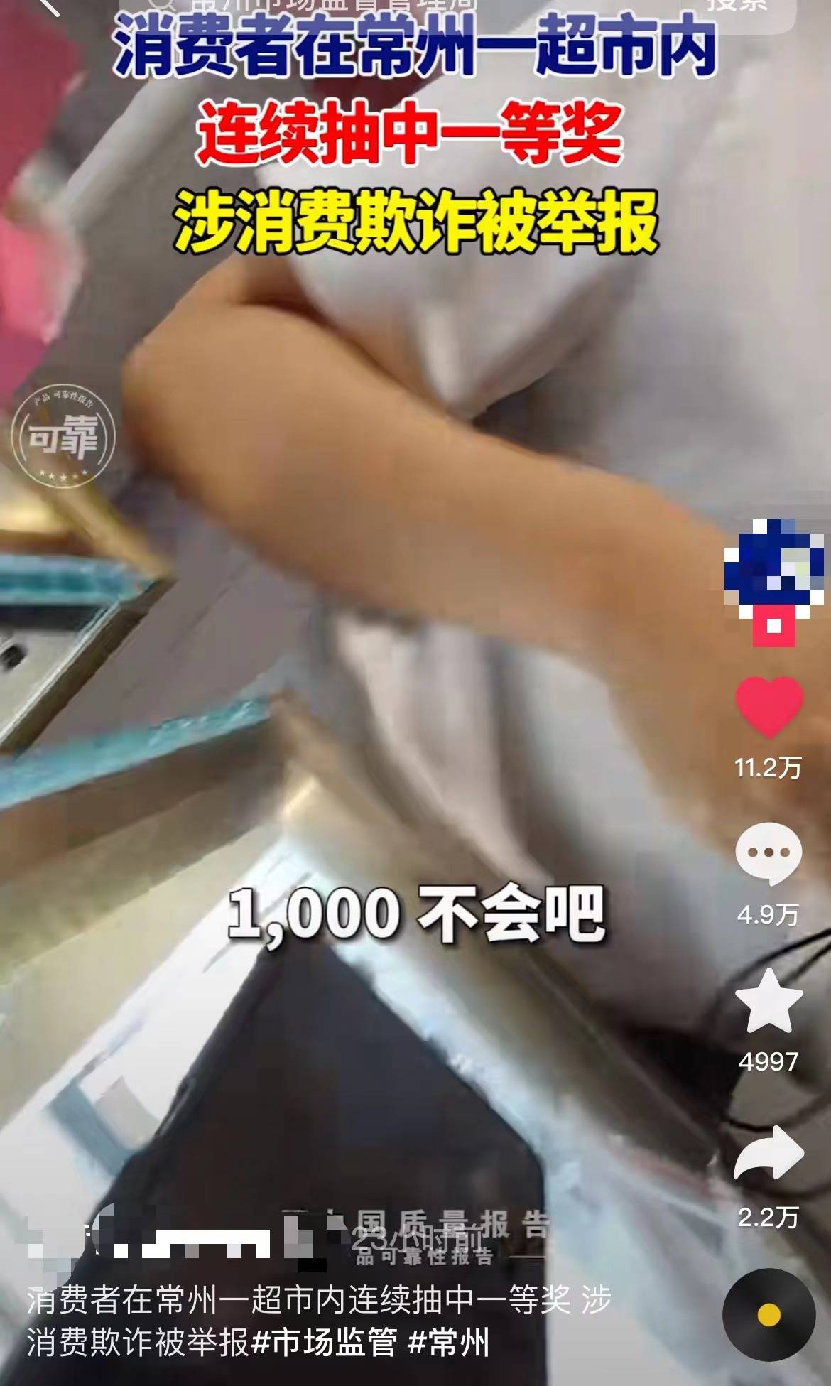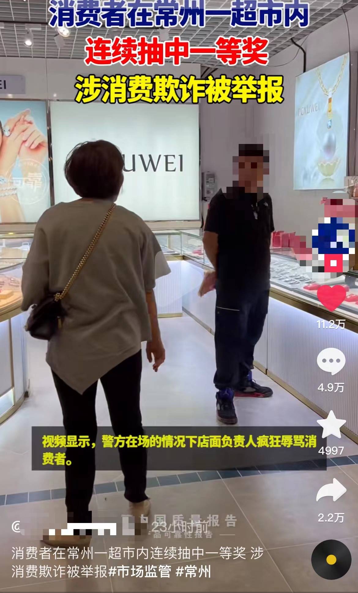 近日,有网友发布视频称,消费者在常州一超市的珠宝店连续抽中千元一等奖,怀疑其涉嫌消费欺诈。对此,辖区市场监督管理局表示,将立案调查。
