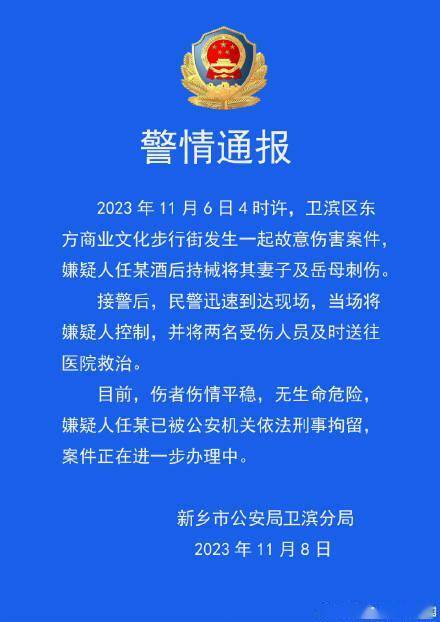 11月8日,据河南新乡警方@新乡卫滨警方在线 通报:11月6日,卫滨区东方商业文化步行街发生一起故意伤害案件,嫌疑人任某酒后持械将其妻子及岳母刺伤。接警后,民警迅速到达现场,当场将嫌疑人控制,并将两名受伤人员及时送往医院救治。目前,伤者伤情平稳,无生命危险嫌疑人任某已被公安机关依法刑事拘留,案件正在进一步办理中。