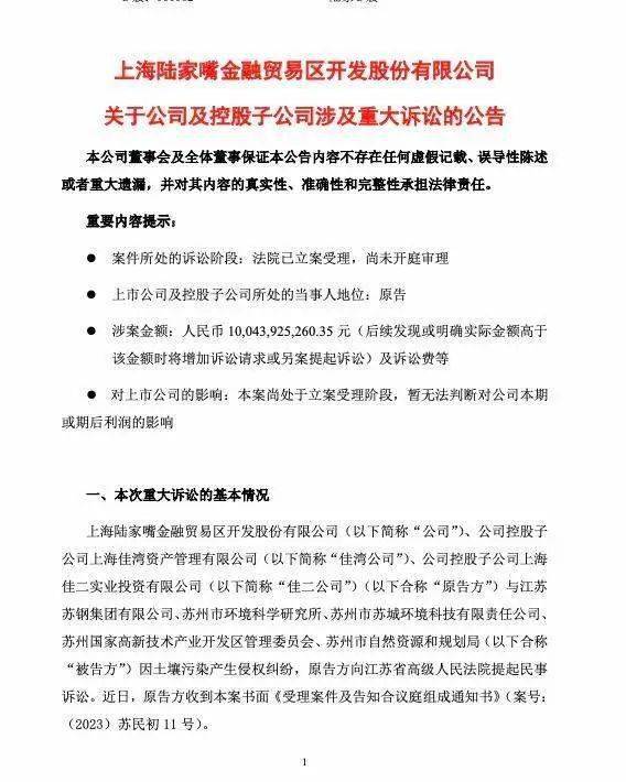 在这份公告中,陆家嘴透露其下属子公司因土壤污染问题,将江苏苏钢集团有限公司、苏州市环境科学研究所、苏州市苏城环境科技有限责任公司、苏州国家高新技术产业开发区管理委员会、苏州市自然资源和规划局等五家单位告上法庭。这起案件近日收到了江苏省高级人民法院的书面案件受理通知书。