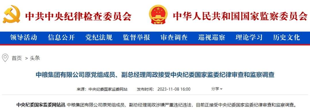 中粮集团有限公司原党组成员、副总经理周政涉嫌严重违纪违法,目前正接受中央纪委国家监委纪律审查和监察调查。