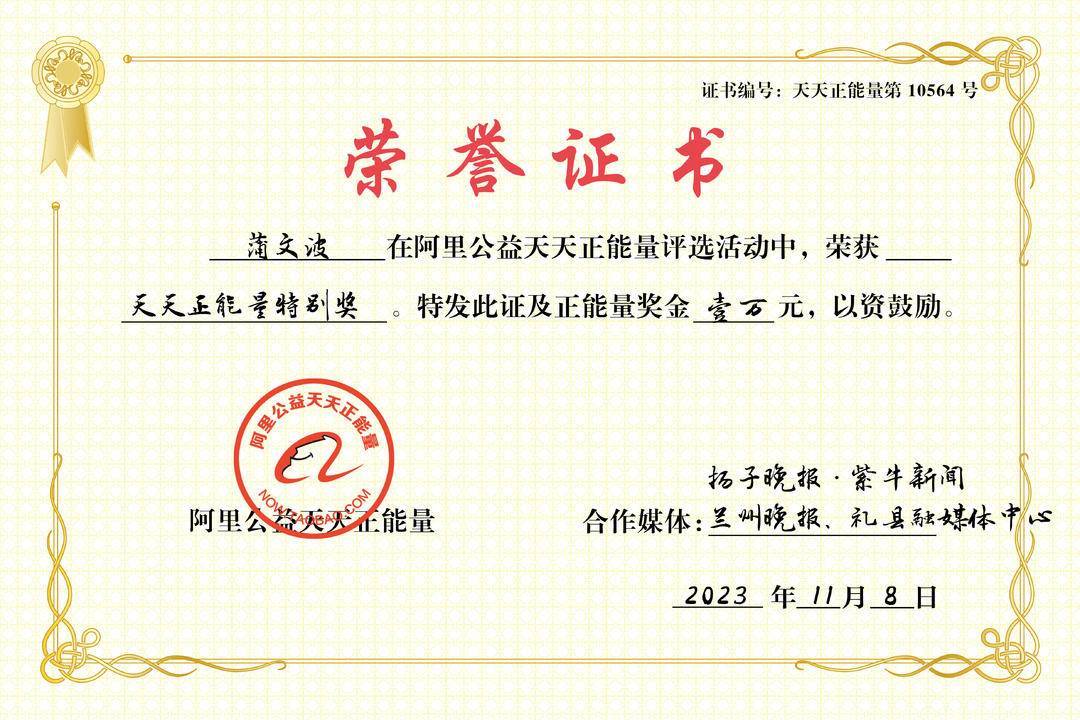 扬子晚报网11月8日讯(记者闫春旭)11月7日晚,扬子晚报紫牛头条报道了甘肃小伙蒲文波大学毕业后患上渐冻症、靠两根手指写了本小说的故事,令众多网友泪奔,不少网友点赞:“令人敬佩,为小伙子点赞!”11月8日,扬子晚报·紫牛新闻联合兰州晚报、礼县融媒体中心以及阿里公益天天正能量,为蒲文波颁发正能量特别奖及1万元公益金。谈到获奖的事情,蒲文波感到很意外,也很荣幸,“我只是一个认认真真活着的渐冻人,我相信这个奖项会鼓励我写出更有价值的东西,成为一个更好的人,因为这个社会是奖励好人的、奖励真善美的。”