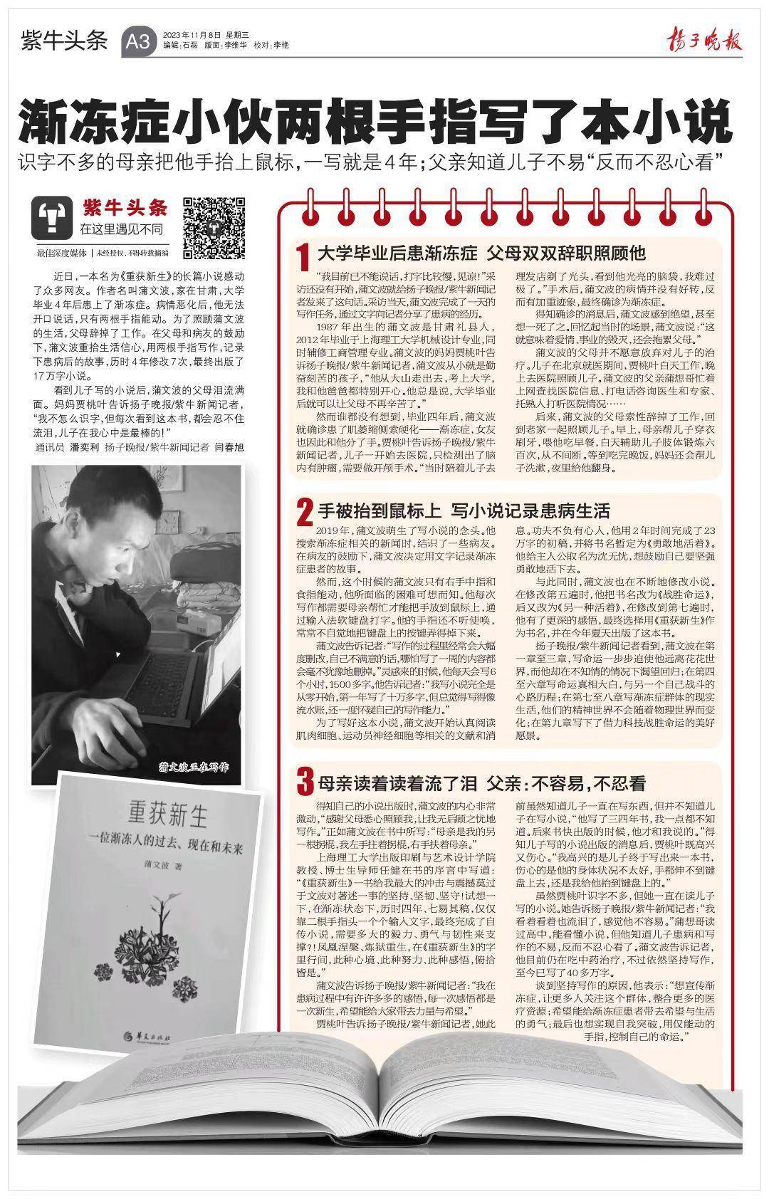蒲文波非常感谢扬子晚报紫牛头条的报道,“是紫牛新闻把我带入公众视野,让更多人看到了我、看到了大众视野盲区的渐冻人。感激之余,我的内心是很有成就感的,自己终于为渐冻人做了宣传,从而给渐冻症的研究带来了被人支持的可能性,我没有能力像蔡磊先生一样为渐冻症科研做贡献,却有信心成为一个渐冻人作家,写出更多正能量的文字。”