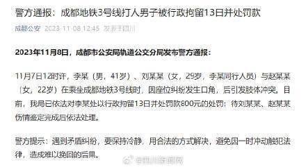 11月8日,成都市公安局轨道公交分局发布警方通报:11月7日12时许,李某(男,41岁)、刘某某(女,29岁,李某同行人员)与赵某某(女,22岁)在乘坐成都地铁3号线时,因座位纠纷发生口角,后引发肢体冲突。目前,我局已依法对李某处以行政拘留13日并处罚金800元的处罚;待刘某某、赵某某伤情鉴定完成后依法处理。