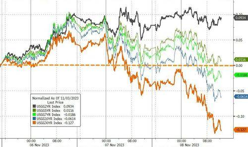美债收益率走势分化,短债收益率上行,长债收益率连跌两日。