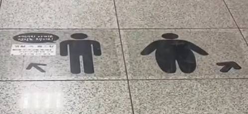 据新加坡《今日报》7日报道,视频中,该网友将手机镜头对准地铁站台路面上的两个人形贴纸,左边的明显较瘦,指向楼梯,右边的较胖,指向自动扶梯。这名网友一边拍一边往自动扶梯的方向走去,还在视频上配上文字:“想象一下你每天都要看见这个标识……”
