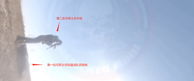 可惜还是晚了,拍摄者正对的第二名乌军士兵跑近后,二话不说就把枪托抵在腰部对拍摄者开枪,随着镜头高度和角度变化可以看出此时拍摄者中枪倒地,仍在工作的摄像头拍下随后的情况:第一名乌军已经和另一名督战队在推搡时倒地,推测此时这名乌军士兵也对督战队开枪了,第二名乌军快走几步到两人跟前又补了一枪。虽然看不清到底是对谁开枪,但从拍摄者中枪来判断,这名乌军士兵不太可能对自己战友开枪,只能是对督战队开枪。