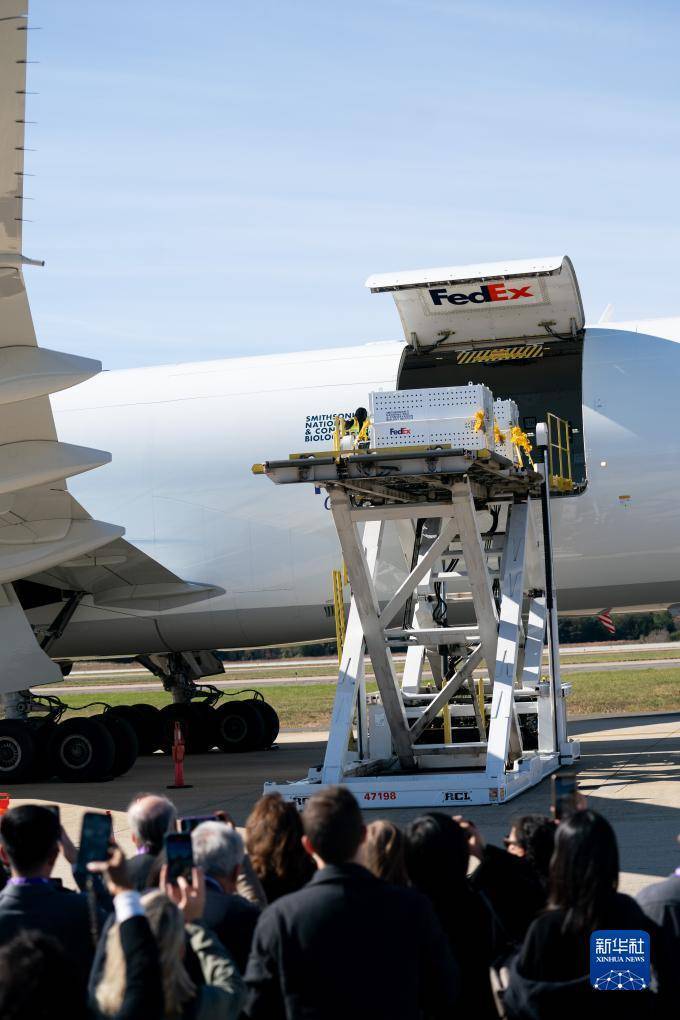 11月8日,在美国弗吉尼亚州的华盛顿杜勒斯国际机场,装有大熊猫的特制“旅行包厢”运上专机。
