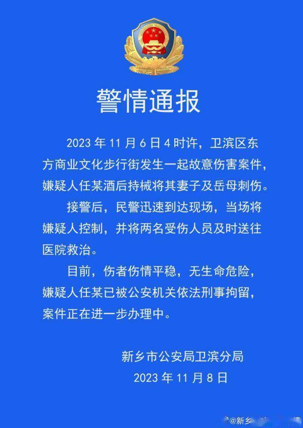 2023年11月6日4时许,卫滨区东方商业文化步行街发生一起故意伤害案件,嫌疑人任某酒后持械将其妻子及岳母刺伤。