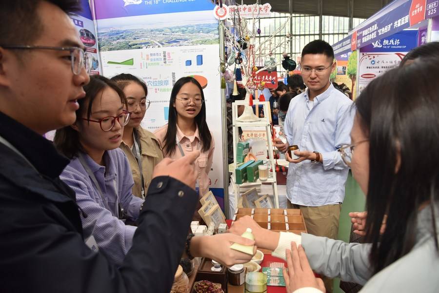在贵州大学举办的第十八届“挑战杯”全国大学生课外学术科技作品竞赛上,湖北中医药大学参赛队伍进行中医药产品体验展示(10月28日摄)。新华社记者 李凡 摄