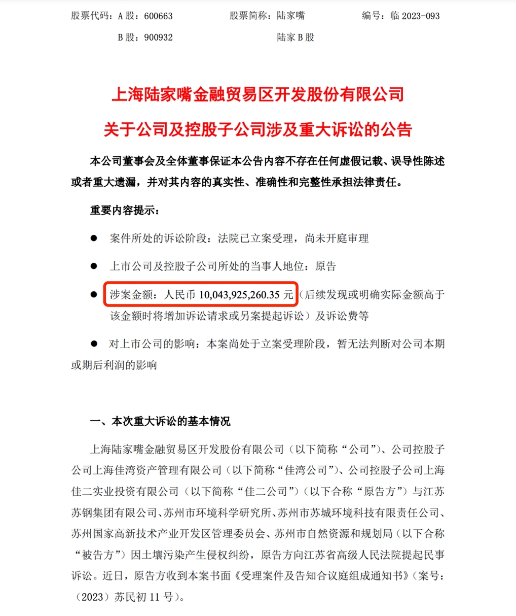 公告称,陆家嘴及其下属子公司因土壤污染问题,向江苏省高级人民法院提起民事诉讼,被告方为江苏苏钢集团有限公司(苏钢集团)、苏州市环境科学研究所、苏州市苏城环境科技有限责任公司、苏州国家高新技术产业开发区管理委员会、苏州市自然资源和规划局。涉案金额约100.44亿元及诉讼费等。