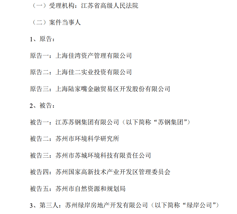 也正是在此背景下,陆家嘴方面因土壤污染产生侵权纠纷,向江苏省高级人民法院提起民事诉讼,索赔100.44亿元。5名被告分别为:苏钢集团、苏州市环境科学研究所、苏州市苏城环境科技有限责任公司、苏州国家高新技术产业开发区管理委员会、苏州市自然资源和规划局。