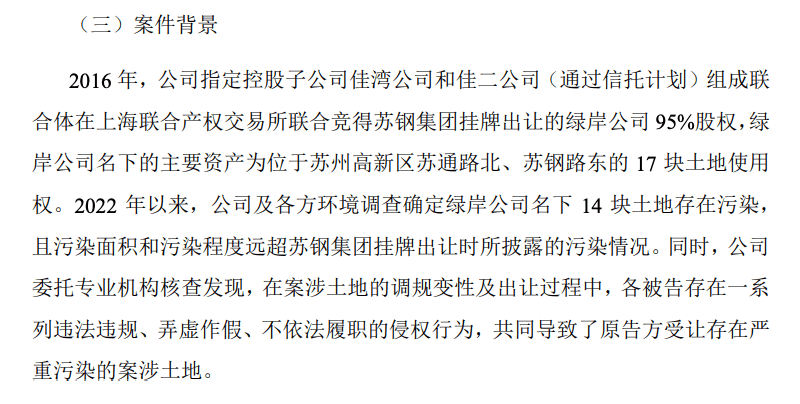 陆家嘴最新披露的公告显示,2022年以来,公司及各方环境调查确定苏州绿岸名下14块土地存在污染,且污染面积和污染程度远超苏钢集团挂牌出让时所披露的污染情况。同时,公司委托专业机构核查发现,在案涉土地的调规变性及出让过程中,各被告存在一系列违法违规、弄虚作假、不依法履职的侵权行为,共同导致了原告方受让存在严重污染的案涉土地。