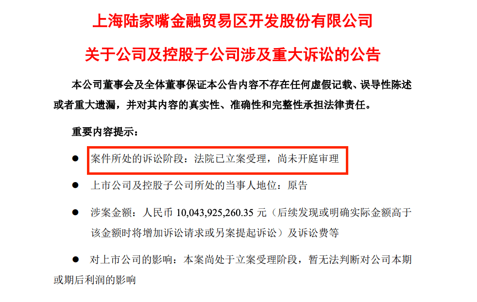 目前,陆家嘴已收到江苏省高级人民法院的书面案件受理通知书。