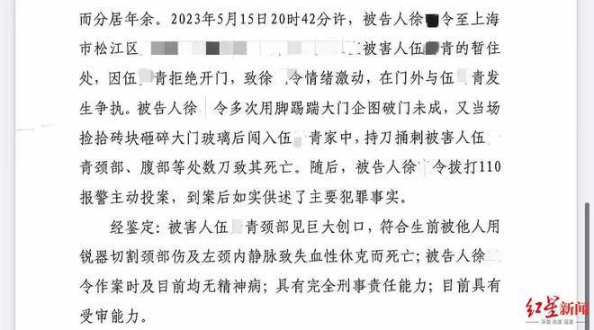 由上海市检察院第一分院向法院出具的起诉书证实了案发经过。起诉书显示,被告人徐某令与被害人伍某青系夫妻关系,二人因感情不和分居年余。2023年5月15日20时42分许,徐某令至伍某青的暂住处,因伍某青拒绝开门,致徐某令情绪激动,在门外与伍某青发生争执。徐某令多次用脚踢踹大门企图破门未成,又当场捡拾砖块砸碎大门玻璃后闯入伍某青家中,持刀捅刺被害人伍某青颈部、腹部等处数刀致其死亡。随后,被告人徐某令拨打110报警主动投案,到案后如实供述了主要犯罪事实。