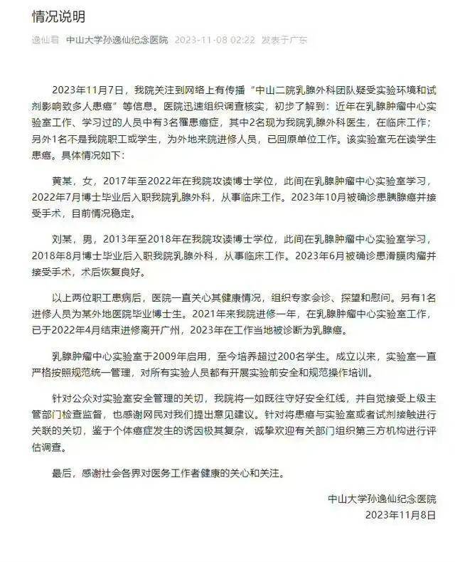 针对网传中山二院一导师团队中有多名学生患癌事件,中山二院8日凌晨发布官方通告,称近年来在乳腺肿瘤中心实验室学习、工作过的人员中有3名在2023年先后被确诊癌症。